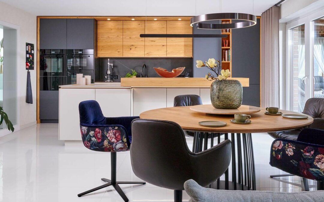 Ein exakt abgestimmtes Farb- und Materialkonzept sorgt für einen fließenden Übergang von der Küche, über den einladenden Essbereich bis hin zum gemütlichen Rückzugsort mit behaglichem Kamin. Besonders die neu realisierte Feuerstelle war ein Herzenswunsch unserer Kundin. Wir haben den gläsernen Kamin elegant in die Wohnwand integriert. Der ebenfalls eingesetzte Flat Screen lässt sich per Knopfdruck zur Kunstgalerie umfunktionieren oder man kann auf ihm schlicht und ergreifend fernsehen. Das Glas Wein oder Lieblingsbuch findet auf den Beistelltischen aus massiven Baumscheiben Platz. Natur und Extravaganz im Herzen des Westmünsterlandes. Ein wie jedes Projekt einzigartiges Unterfangen, das unsere Kunden von Glück erfüllt.