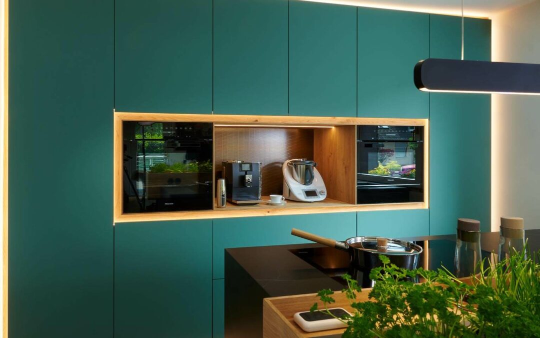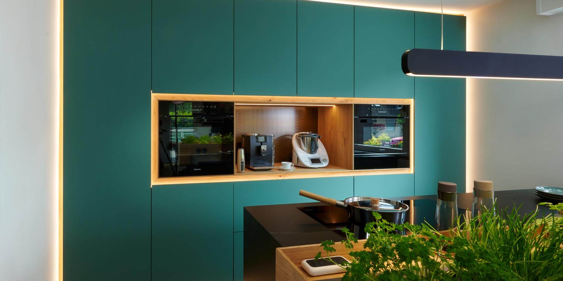 Auf Wunsch unserer Kunden bauten wir einen Kräutergarten hinter das Induktions-Kochfeld. Eine Insel mit grüner Oase, die das Würzen mit frischen Kräutern zum Spaziergang macht.